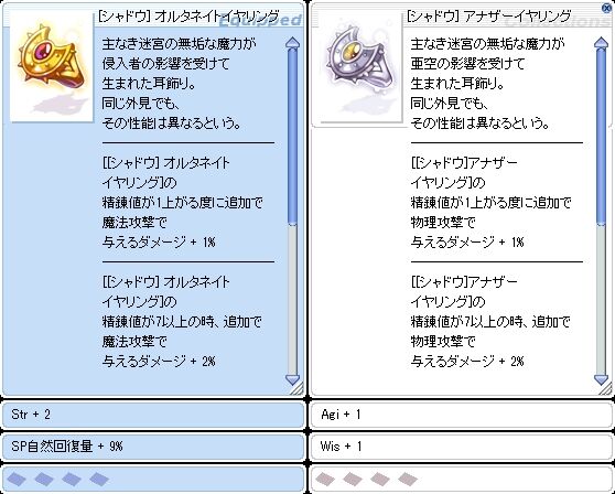こちらの画像からわかるとおり、アナザーシリーズとオルタネイトシリーズでは、部位ごとに基本性能が異なりますので、たとえば「[シャドウ] アナザーイヤリング[0]」と「[シャドウ] オルタネイトペンダント[0]」を同時に装備すれば物理攻撃に特化できます。(精錬はお忘れなく…!)